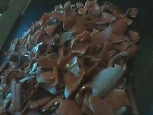 經(jīng)刀切式破碎機(jī)破碎后的鋁塑管料樣,為5公分左右的片狀。